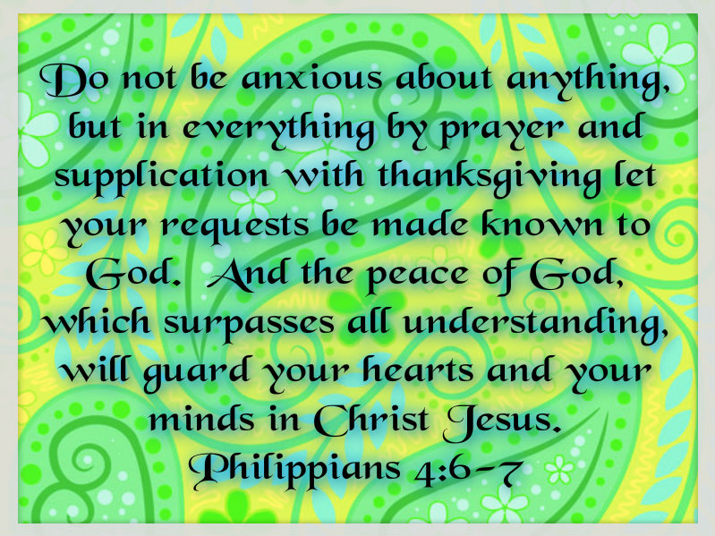 Do not be anxious about anything, but in everything by prayer and supplication with thanksgiving let your requests be made known to God. And the peace of God which surpasses all understanding will guard your hearts and your minds in Christ Jesus. Philippians 4:6-7