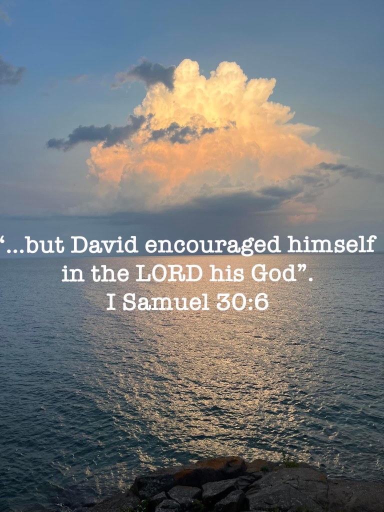 In 1 Samuel 30, David and his mighty men have been victorious in battles and are returning to their families in Ziklag. When they arrive home, they find their village burned down and their wives and children kidnapped by the Amalekites. All of the men were understandably very upset but then decided to take it out on David and were talking about stoning him. Verse 6 says, “And David was greatly distressed, for the people spoke of stoning him, because all the people were bitter in soul, each for his sons and daughters. But David strengthened himself in the LORD his God.” Did you see the line, “But David strengthened Himself in the Lord, His God”. In the King James Version it reads, “but David encouraged himself in the LORD his God”. How do we encourage/strengthen ourselves and others in the LORD?